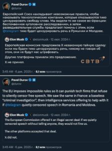 «ЕС устанавливает невыполнимые правила, чтобы наказывать технологические компании, отказывающиеся молчаливо цензурировать свободу слова», — Павел Дуров о непубличных требованиях европейских властей к X и Telegram, сообщает eNews.