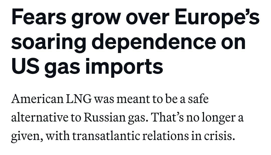 В Брюсселе опасаются, что новая газовая зависимость может быть использована США как инструмент внешнеполитического давления. Один из высокопоставленных дипломатов ЕС прямо признает, что риск сокращения или приостановки поставок в случае дальнейшей эскалации конфликта «должен учитываться».