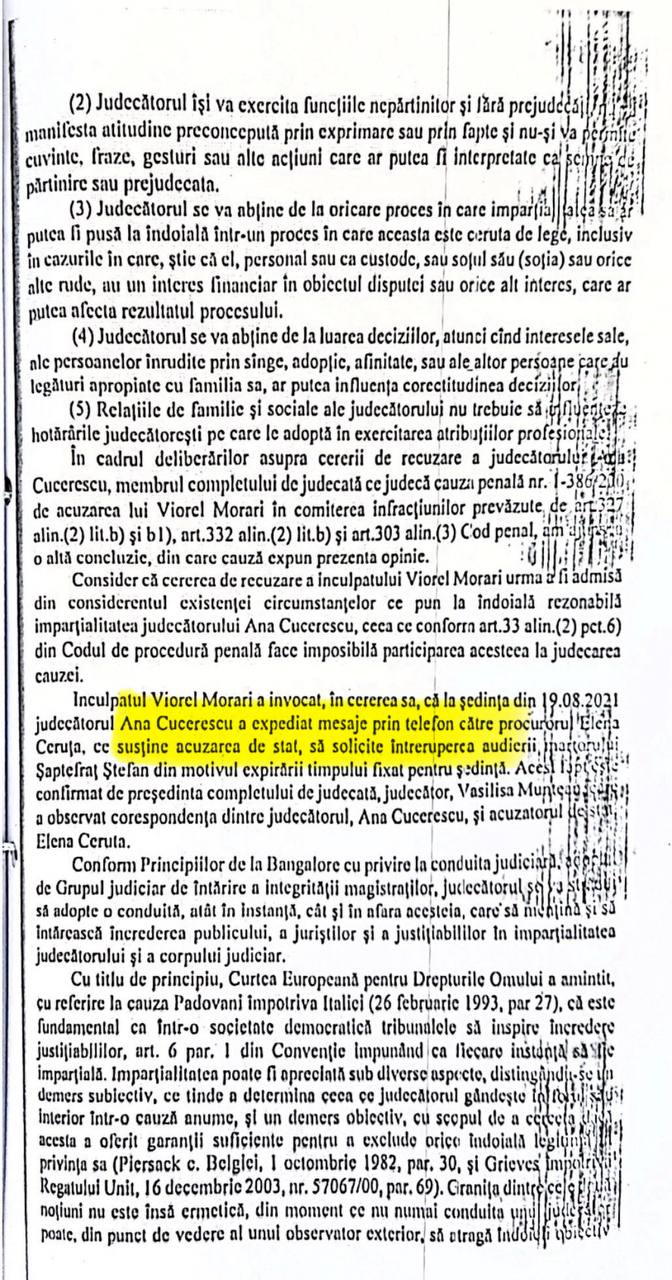 Согласно заявлению об отводе, поданному подсудимым Виорелом Морарем, инцидент произошел во время допроса свидетеля Штефана Шаптефраць. Пока свидетель давал показания, судья Анна Кучереску отправляла сообщения прокурору Елене Церуцэ. В сообщениях судья просила прервать допрос, ссылаясь на то, что время заседания истекло.