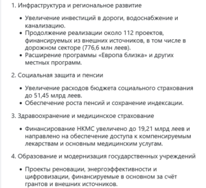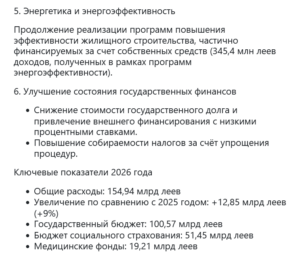 Согласно документу, расходы национального государственного бюджета оцениваются в 154,94 млрд леев, что на 9% больше, чем в 2025 году. В доле ВВП они увеличиваются до 41,1%.