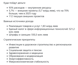 Проект государственного бюджета на 2026 год предусматривает доходы в размере 79,67 млрд леев, расходы — 100,57 млрд леев, а также дефицит в 20,9 млрд леев.