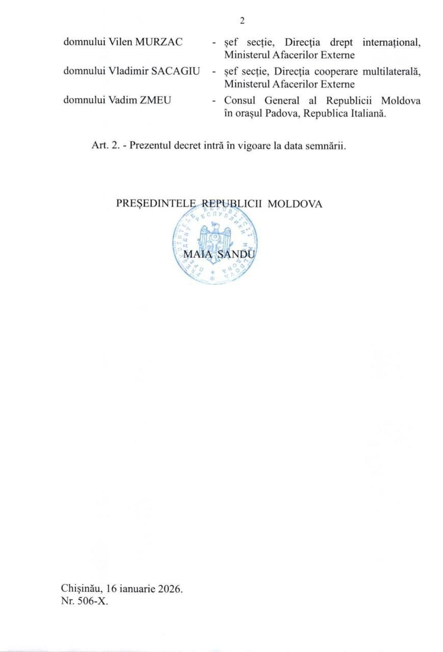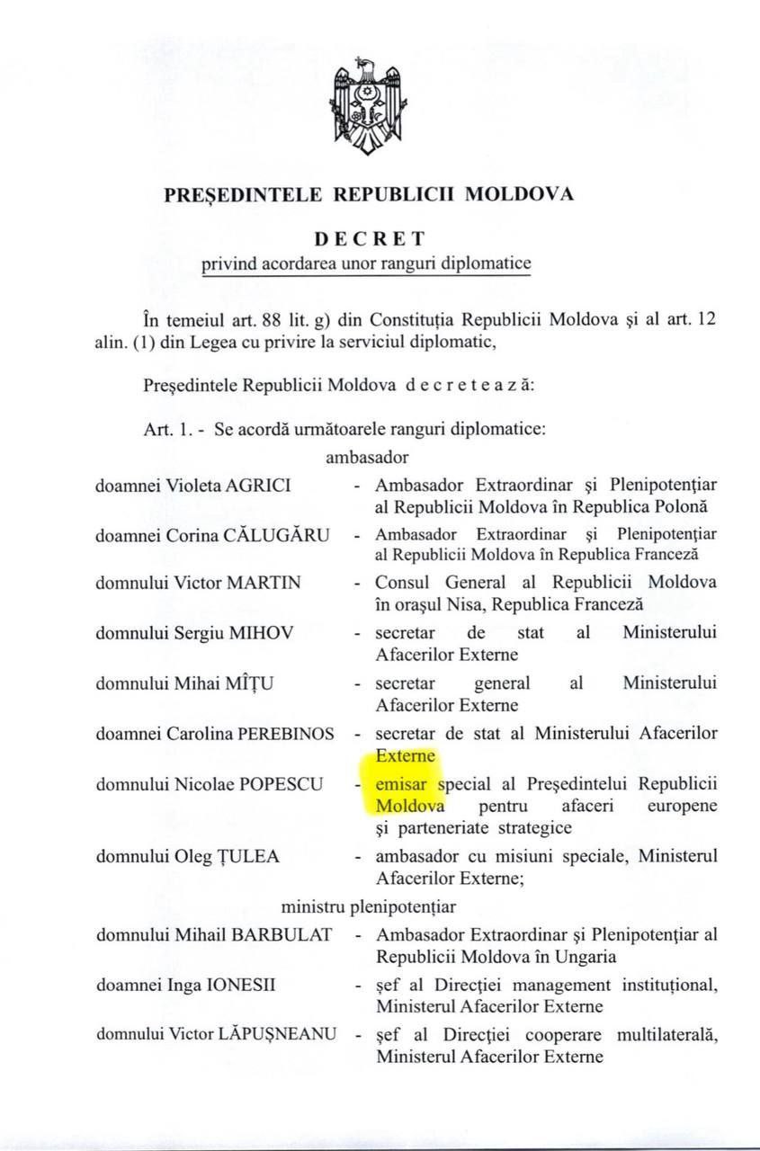 Указом от 16 января 2026 года Нику Попеску, занимающий должность спецпосланника президента по евроинтеграции, официально получил высший ранг — посла , сообщает eNews.